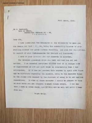 How does a bankrupt country pay for losing a war? Archive documents from the University of Edinburgh, School of Chemistry cast a fascinating light on a short-lived attempt to resolve this conundrum. By Peter Fuller How does a bankrupt country pay for losing a war? Archive documents from the University of Edinburgh, School of Chemistry cast a fascinating light on a short-lived attempt to resolve this conundrum. By Peter FullerArchives of the University of Edinburgh detail the purchase of precision balances and Bohemian glassware from Bonn, in 1920 and 1921. The letters, written by Professor James Walker, the Chair of Chemistry responsible for the Kings Buildings Chemistry building, show that the German supplier was required to pay money back to the purchaser, under the German Reparation (Recovery) Act 1921"Subject to the provisions of this Act, after the thirty-first day of March, nineteen hundred and twenty-one, on the importation into the United Kingdom of any German goods to which this Act applies, the importer shall pay to the Commissioners of Customs and Excise (herein after referred to as the Commissioners) such proportion of the value of the goods, not exceeding fifty per cent., as the Treasury may from time to time prescribe" The balances were bought from C Gerhardt, a family firm still trading in laboratory equipment and analytical systems today.This scheme quickly failed, as receipts to Britain became disproportionately large compared to money returned to the other Allies. This problem is reflected in one of the archive letters, which alludes to a date after which receipt of such extra payment may become problematic. These purchases were part of consignment of goods transported from Hamburg on the SS Weimar, a Leith-built cargo ship from 1889 with a capacity of 1580 tons, which remained on the Leith/Hamburg run until she was broken up for scrap in 1933.Ultimately, of course, the War Reparation scheme proved unworkable, and despite various attempts to alleviate the problem, such as the Dawes Act of 1924, where in order to combat hyperinflation the German government was loaned money by the U.S.A in the short term so that it's economy could get some relief, however the issue with this was that any negative impact on the American economy would have a domino like effect on the German economy, as was seen after the wall street crash of 1929. The lack of financial resolution ultimately contributed to the rise of Nazism and arguably, the Second World War. This article was published on 2024-03-18