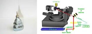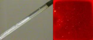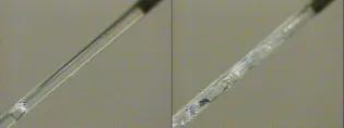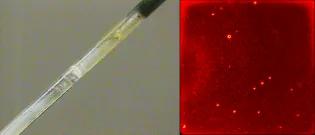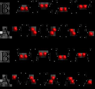 Many interesting compounds are liquids or gases at room temperature, and Edinburgh is one of only a handful of chemistry departments in the world where expertise is available for the determination of the crystal structures of these materials. This type of experiment allows the structures of the very simplest molecules to be determined in the solid state - molecules unencumbered by steric effects of bulky substituents. We can, of course, also solve structural problems that are resistant to other techniques like NMR in the case organic molecules, which exhibit rapid torsional flexibility. For low temperature experiments, the sample is contained within a capillary, which is mounted directly on the diffractometer. The sample is then crystallised in situ by means of a zone refinement technique using an infra-red laser. Data are collected in the usual way. Figure left: Goniometer head with fibre attachment used for single crystal measurements. Right optical heating and crystallisation device The sample is placed into a glass capillary, which in turn is mounted on a goniometer head. The sample is then placed on the diffractometer and a single crystal is grown in situ with an optical heating and crystallisation device (OHCD). The OHCD device is an infra-red, 25 Watt CO2 laser which is used to heat the sample under study. The laser beam position and power output are computer controlled for accuracy.The sample is cooled using the cryostream until solid. However, supercooling can occur where by the sample remains a liquid at a temperature beneath its melting point (left). Flash freezing the sample usually induces glass formation (right). By moving the laser of the OHCD device along the length of the capillary (left), the glass may be annealed into a polycrystalline powder (middle). This can be observed both from the appearance of the sample and its diffraction pattern (right). Careful manipulation of the power of the laser, together with the time taken to scan the laser up and down the capillary containing the sample, slowly induces single crystal growth (left). The quality of the crystal is constantly monitored using its diffraction pattern (right). Growth after 6 hours is shown After growing a crystal and zone refining it with the laser for 12 hours the diffraction pattern has improved dramatically and the crystal growth and the correspoding diffraction pattern are shown. By combining this experimental technique with that of gas phase electron diffraction (see Prof. Rankin), very simple molecules can be studied in the solid and gas phase. A recent example of such a combined investigation is shown in the structure of GaBH6. Unlike the structure in the gas phase, in which GaBH6 forms a similar structure to that of diborane, the GaBH6 molecules forms a helical polymeric structure in the solid state. The structure of acetone has been studied at both low temperature and at high pressure. At low temperature, acetone has been shown to crystallise in two phases; a metastable C-centred orthorhombic phase and a stable primitive orthorhombic phase. The metastable phase resembles that of the high pressure structure, having a C=O···C=O distance of 3.587(3) Å, which is significantly greater than that observed in the high pressure studies. The metastable phase readily decomposes to the primitive phase, in which acetone forms two layers (A and B) as shown. In layer A, the acetone molecules form a "chain" like structure, with head to tail C=O···C=O contacts (3.458(3) Å) In layer B, each acetone molecule forms close contacts with three neighbours. The C=O···C=O contacts between "pairs" of acetone molecules is observed to be 3.300(3) Å, while those between the "single" acetone and the associated "pair" is 3.458(3) Å. This article was published on 2024-08-30